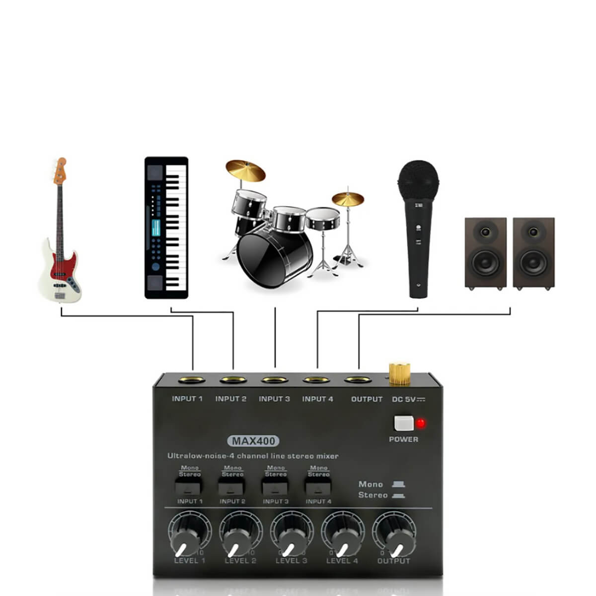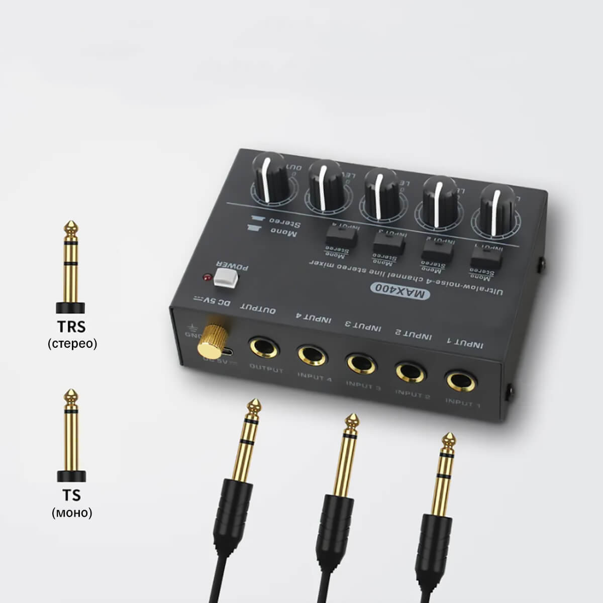 Это стереофонический 4-канальный микшер, позволяющий микшировать микрофон, гитару, бас, клавишные, электронные барабаны и т. д.