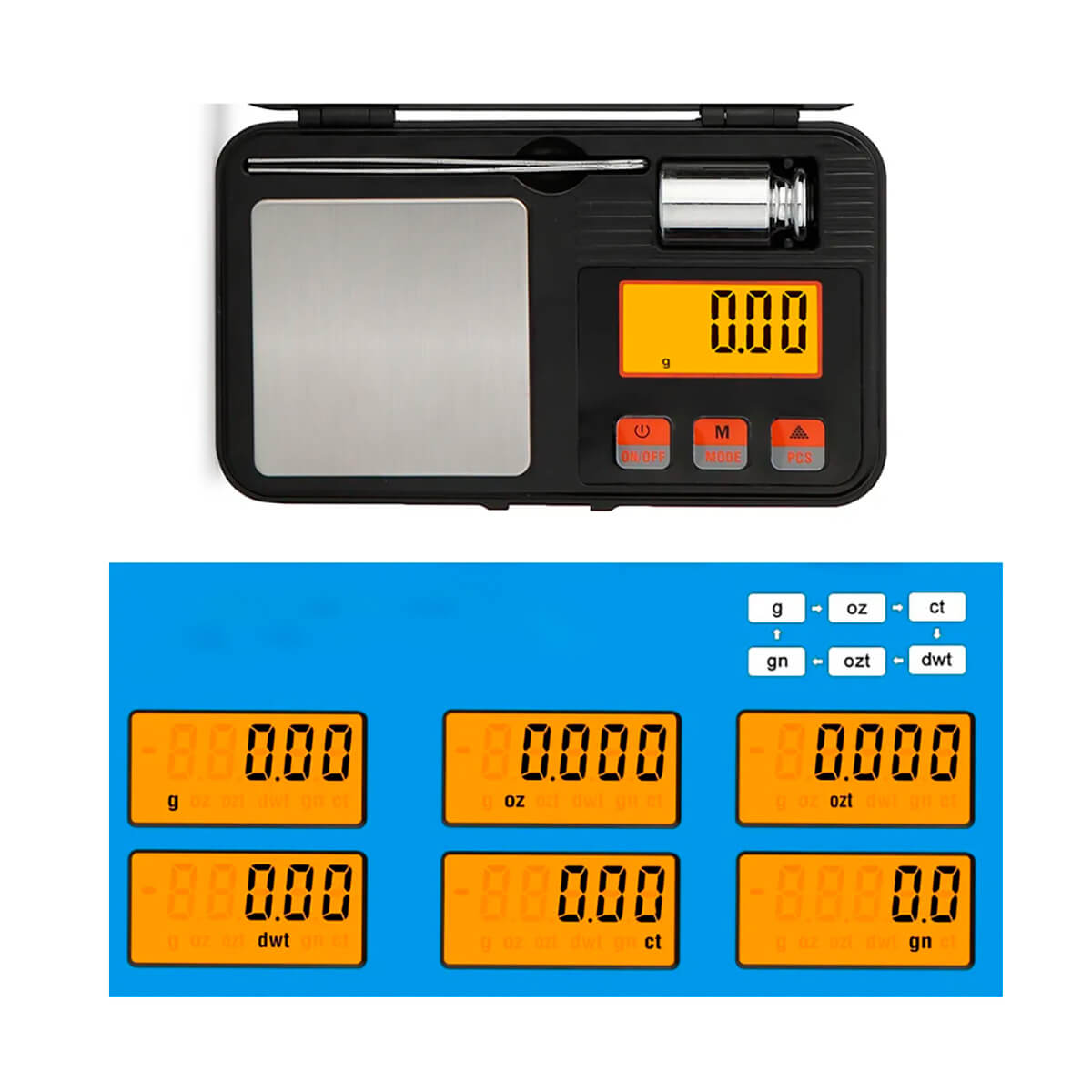 ЖК-дисплей с оранжевой подсветкой для удобного чтения различных единицах измерения: г / унц. / Гц. / Гт.